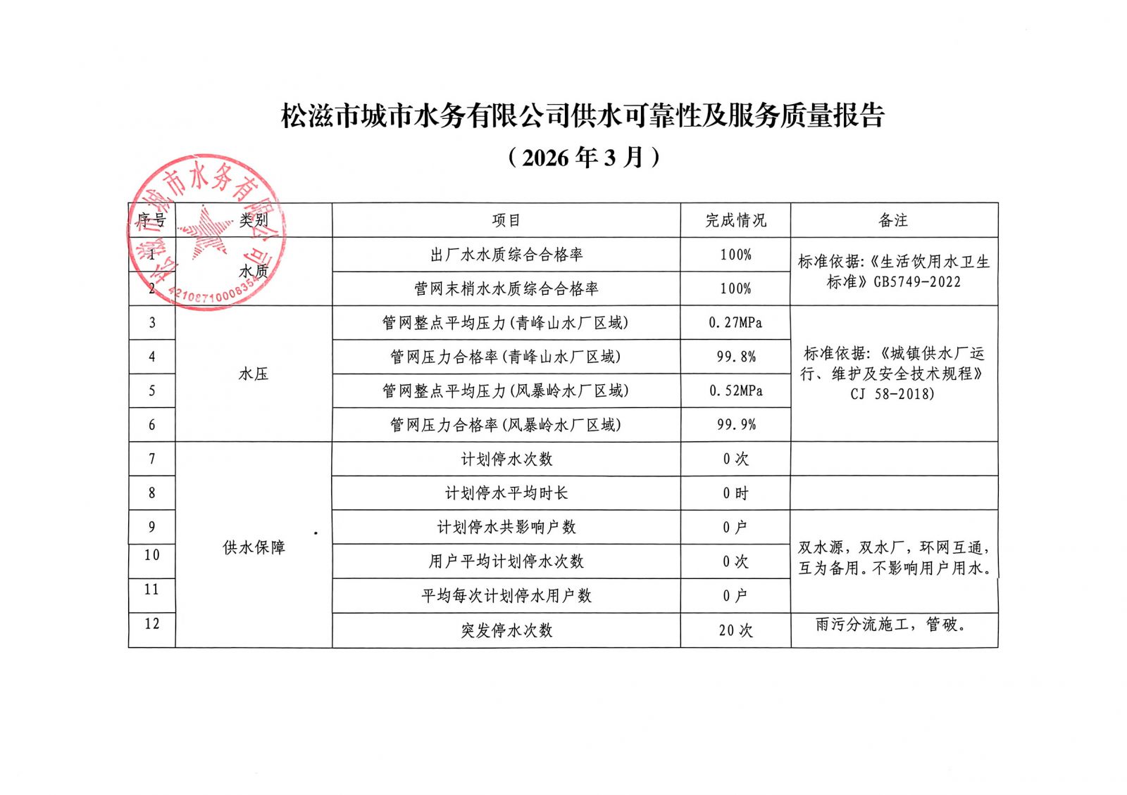 松滋市城市水务有限公司供水可靠性及服务质量报告 (2026年3月)