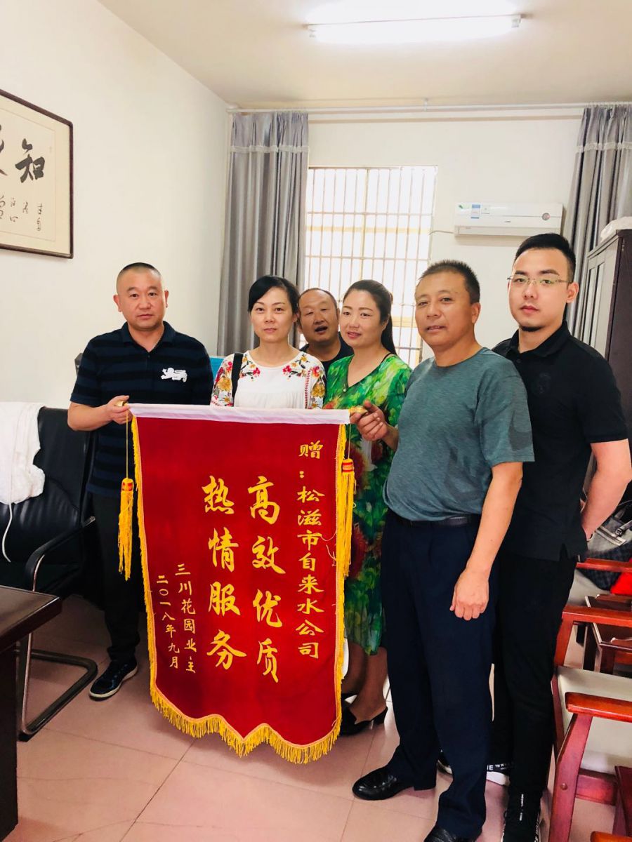 供水新闻及时解决用水难题 业主送锦旗致谢9月11日,谢家渡社区领导和数名三川花园业主代表来到松滋市自来水公司,将一面绣有“高效优质,热情服务”的锦旗送给市自来水公司,对市自来水公司为三川花园居民小区广大群众排忧解难表示感谢。