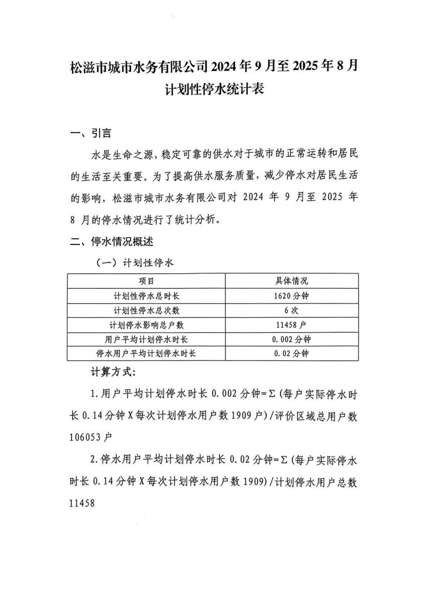 松滋市城市水务有限公司供水可靠性及服务质量报告(2025年8月)