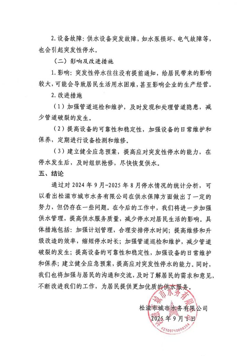 松滋市城市水务有限公司供水可靠性及服务质量报告 (2025年9月)