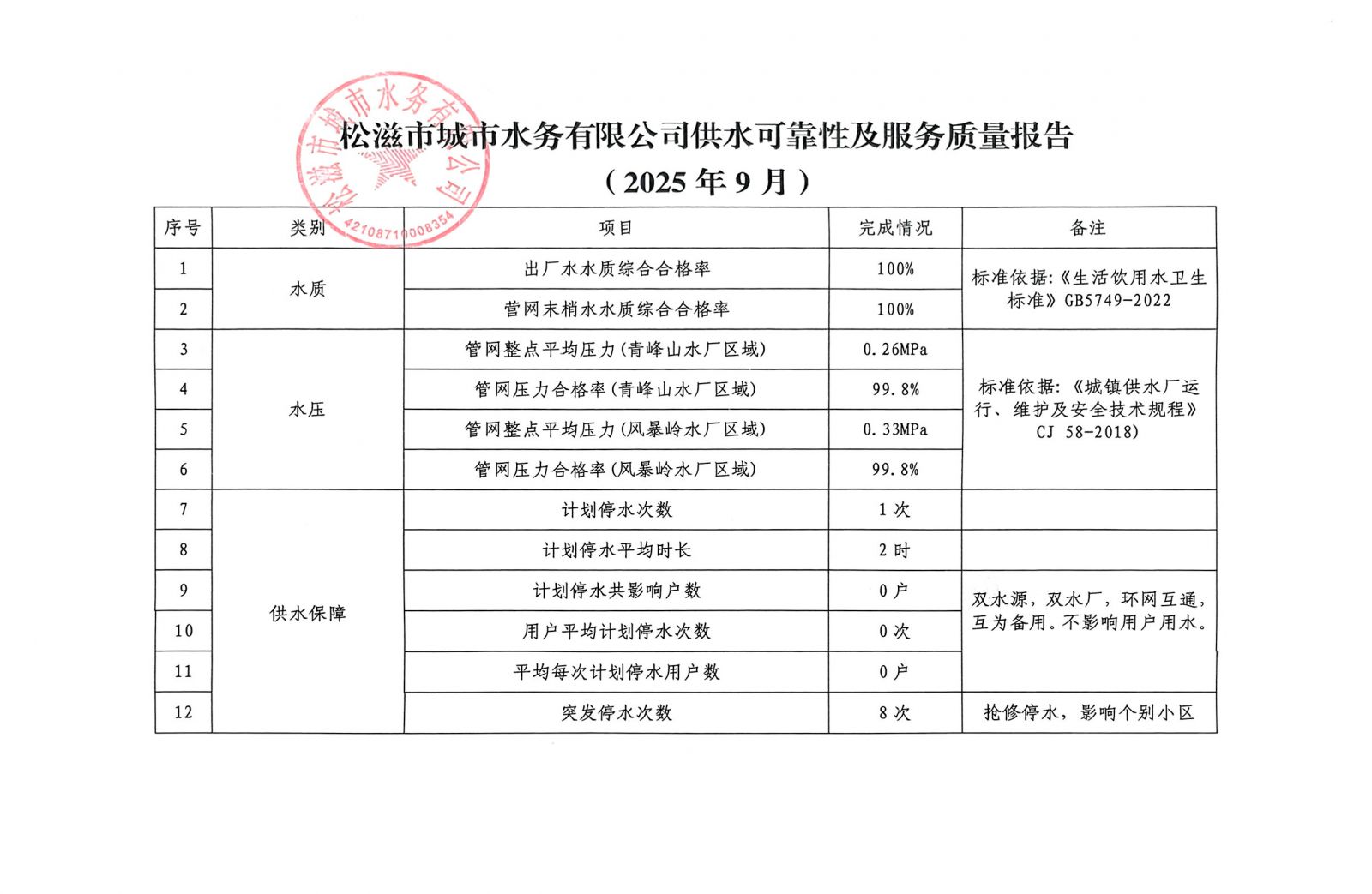 松滋市城市水务有限公司供水可靠性及服务质量报告 (2025年9月)