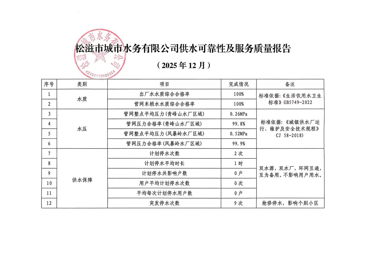 松滋市城市水务有限公司供水可靠性及服务质量报告(2025年12月)
