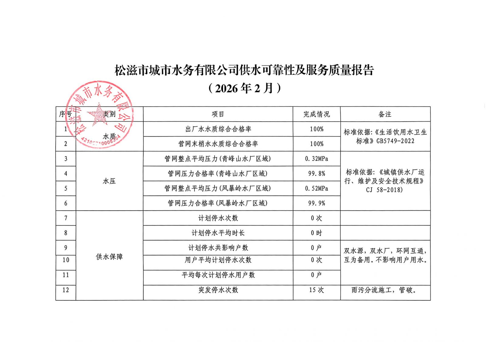 松滋市城市水务有限公司供水可靠性及服务质量报告 (2026年2月)
